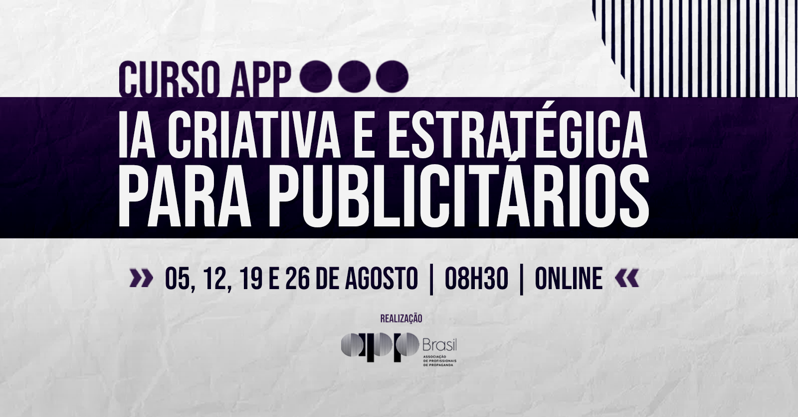 São Paulo (SP) – A APP Brasil (Associação de Profissionais de Propaganda) promove, em agosto, o curso “IA Criativa e Estratégica para Publicitários”, voltado para capacitar profissionais do mercado de comunicação no uso ético, estratégico e produtivo da inteligência artificial. Com carga horária total de 8 horas, dividida em quatro encontros online e interativos (nos dias 5, 12, 19 e 26 de agosto, das 8h30 às 10h30), o curso terá certificação e reunirá nomes de referência em criatividade, inovação, direito digital e inteligência artificial. Link para inscrições: https://www.sympla.com.br/