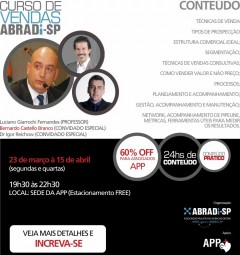 Oito aulas com 3 horas de duração; Dias 23, 25 e 30 de março e 1, 6, 8, 13 e 15 de abril; Segundas e quartas-feiras das 19h30 às 22h30.